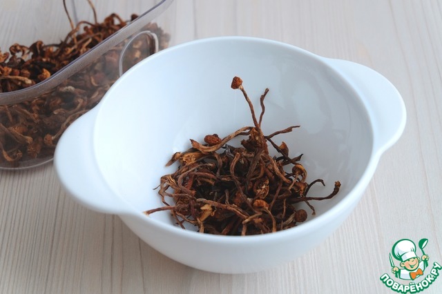 Сушеные опята промыть в двух-трех водах, при необходимости, если опята крупные, можно их нарезать кусочками..