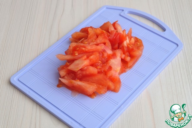 Помидор (1 шт.) обдать кипятком, снять кожицу. Нарезать помидор небольшими дольками.