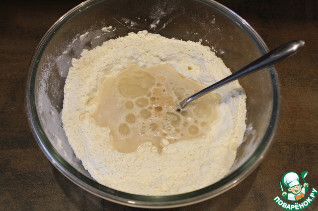 Теперь приступим к тесту. Берём тёплую воду, отливаем две столовые ложки в небольшую ёмкость, добавляем 1 ч. л сахара и 1 ч. л. с горкой дрожжей, хорошо размешиваем и отставляем на 10-15 мин. для активации. Затем в просеянную муку добавляем пол чайной ложки соли, перемешиваем, делаем по центру углубление, выливаем оставшуюся воду, дрожжи и добавляем 1 ст. л. растительного масла. Замешиваем тесто.