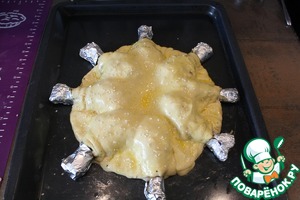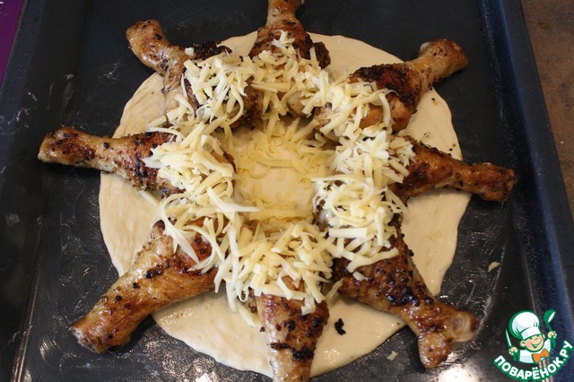 Одну часть раскатываем в тонкую лепёшку. У меня получилась диаметром 25 см. Смазываем противень сливочным маслом, кладём лепёшку и выкладываем ножки так, чтобы часть ножки выступала за края. С верху кладём сыр.