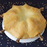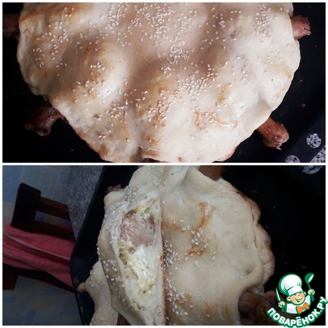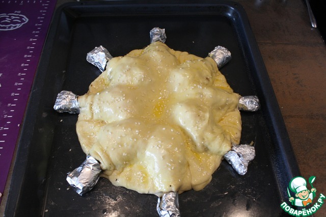 Раскатываем вторую половину теста диаметром чуть-чуть больше чем первую, укладываем сверху, тщательно защипываем края от ножки к ножке. Выступающие части голени заматываем фольгой, верхнюю часть теста смазываем взбитым яйцом или только желтком, по желанию присыпаем кунжутом.