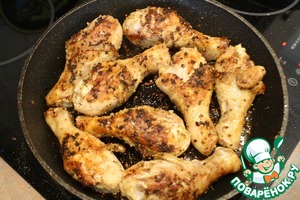 Пока тесто созревает, занимаемся нашей ВИК. Обжариваем ножки с двух сторон до золотистой корочки, накрываем крышкой и на слабом огне доводим до готовности, минут 10-15. Ставим на разогрев духовку на 180 градусов.