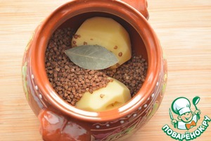 В горшочек положите картофель целиком, гречневую крупу, лавровый лист, соль