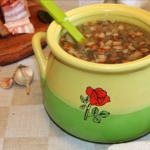 Выньте горшочек из духовки, нарежьте мелко чеснок, заправьте похлебку чесноком, перемешайте и дайте настояться около 5-10 минут.