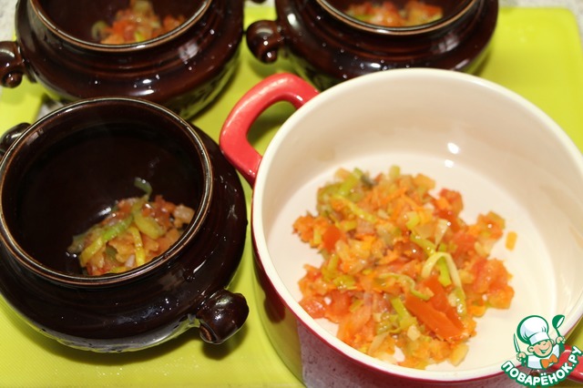 В порционные горшочки положить по столовой ложке овощей; кастрюлька на две порции, соответственно, пропорции для нее удвоить.