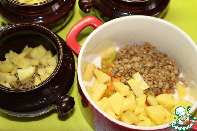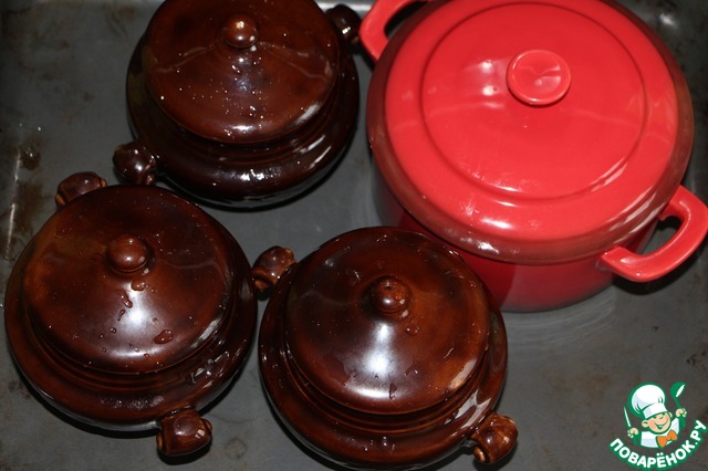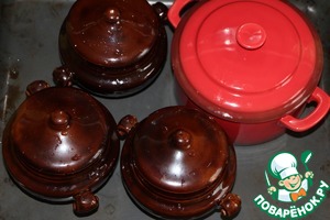 Закрыть крышками и запекать (томить в горшочках) при 170 градусах 1 час, можно и дольше.