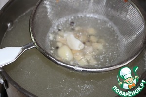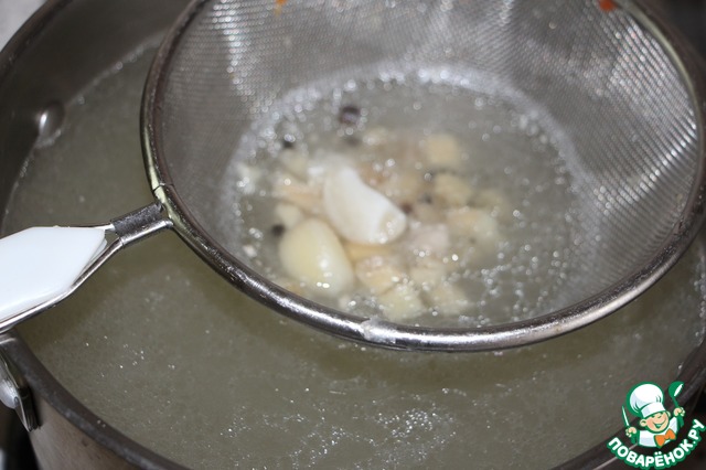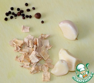 Добавить сушеный (или свежий сельдерей), душистый перец и перец горошек, и чеснок, зубчики целые. Варить не более часа.