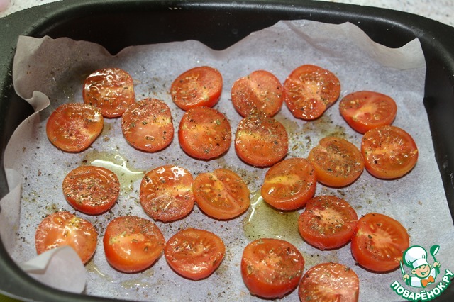 Помидоры черри разрезать пополам, уложить в форму для запекания срезом вверх, посыпать крупной солью, перцем и сухим тимьяном, сбрызнуть растительным маслом.