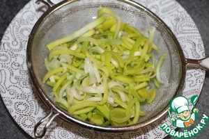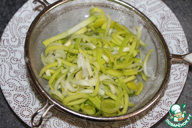 Тем временем лук порей - белую часть и 4 см зеленой - нарезать колечками, промыть под проточной водой, смывая при этом песчинки.