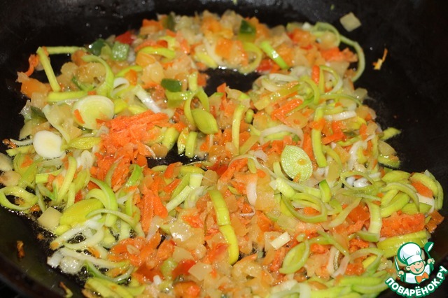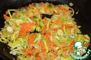 В сковороде разогреть растительное масло, потомить лук на небольшом огне 10 минут, добавить морковь, натертую на крупной терке, готовить 5 минут.