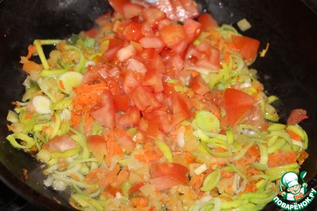 Добавить нарезанный кубикамии помидор, готовить еще 5-7 минут.