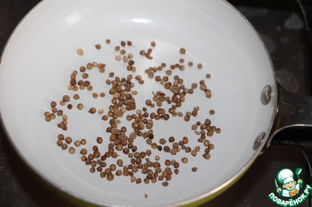 Семена кориандра положить на разогретую сковороду и обжарить на сильном огне, потряхивая сковородку, 2-3 минуты