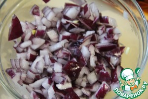 • Красный лук нарезать, засыпать сахаром и оставить на 5 минут. Промыть, отжать. Орехи подсушить на сковороде и порубить (не мелко!)