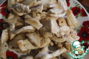 • Грудку нарезать полосочками обжарить на сливочном масле, присолив, до готовности. Переложить на чистую тарелку.