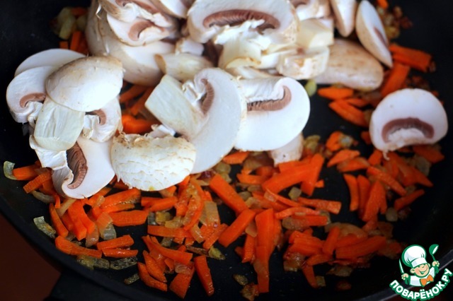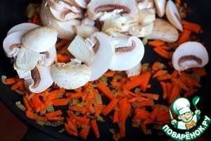 • Морковь с луком порезать, обжарить на растительном масле, добавить нарезанные грибы и обжарить до готовности.
