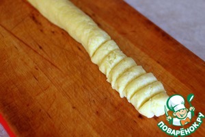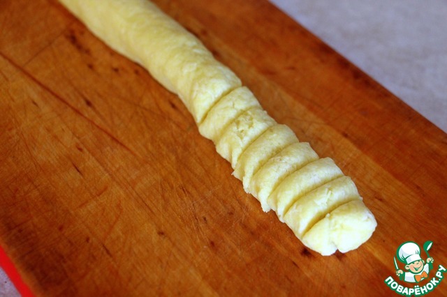 • Из картофельного теста скатать колбаску и нарезать ее на небольшие кусочки.