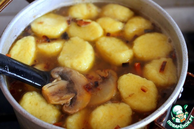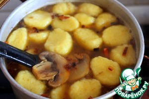 • В гречневый бульон выложить грибную поджарку и картофельные клецки. Добавить перец и лавровый лист, довести до кипения и варить 3-4 минуты.