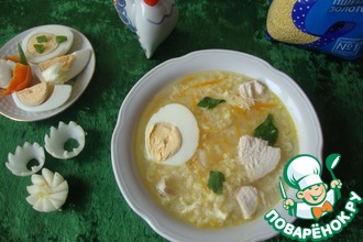 Разлейте суп по чашкам, положите в каждую чашку лепешки из рисовой запеканки, украсьте зеленью и подавайте на стол.