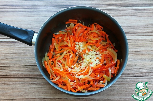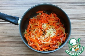 Чеснок мелко нарубить и добавить в зажарку. Обжарить еще в течении минуты.