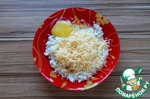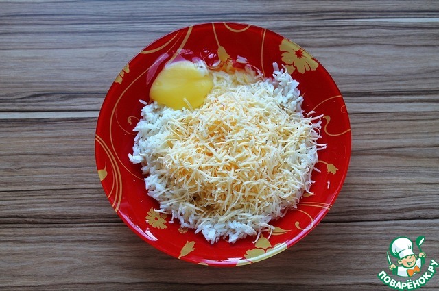 К остывшему рису добавить яйцо и сыр, натертый на мелкой терке.
