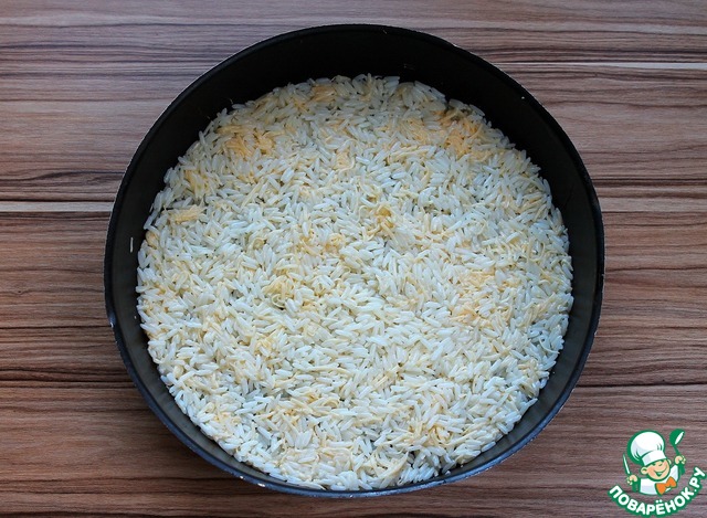 Лучше взять небольшую форму, что бы рисовая масса была не слишком тонкой. Я взяла большую форму и рисовая запеканка у меня получилась тонкой и хрустящей.