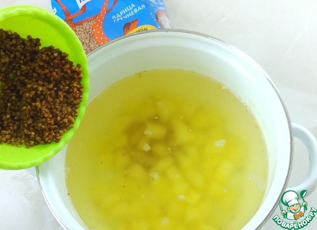 К картофелю добавить промытую гречку ТМ Мистраль, варить после закипания 10 минут.