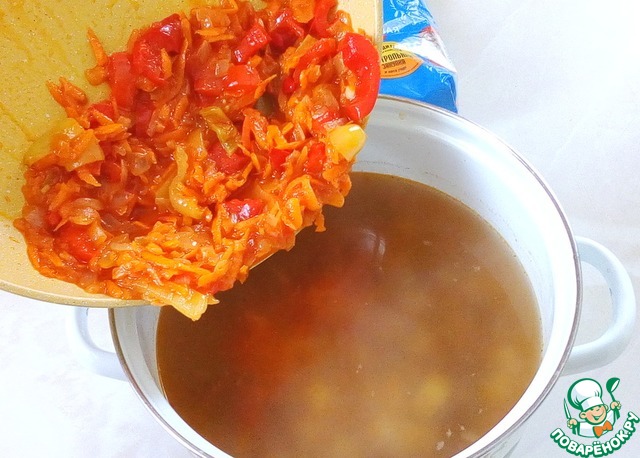 Разогреть сковороду с маслом обжарить лук, добавить морковь. Затем добавить перец и маринад из перца. Тушить на маленьком огне минут 5-6.