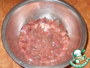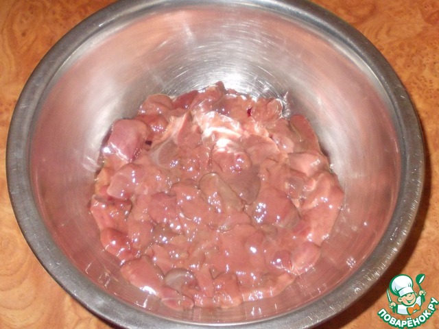 Печень моем, срезаем прожилки, нарезаем на маленькие кусочки.