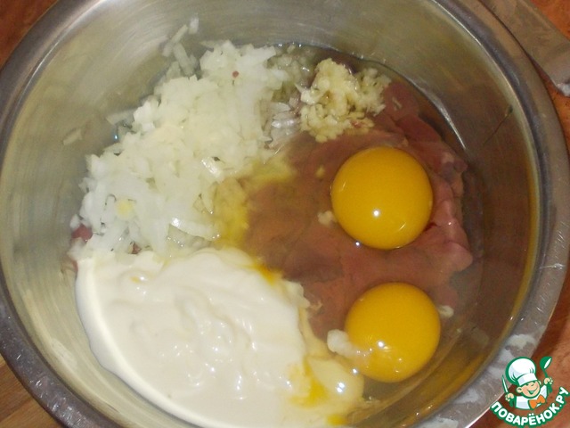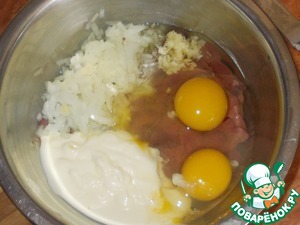 К нарезанной печени добавляем майонез, яйца, чеснок выдавленный через пресс и мелко рубленный лук.