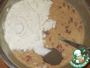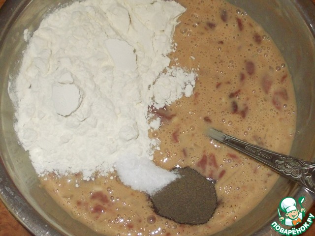 Перемешиваем все до однородной массы. Всыпаем муку, соль, перец, базилик.