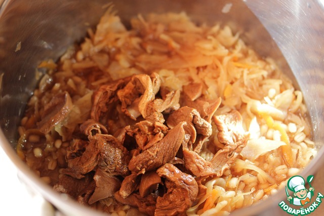 В кастрюлю выложить перловку, квашеную капусту и залить их процеженной водой от замачивания грибов. При необходимости добавить обычной воды. Довести до кипения и готовить на минимальном огне 15-20 минут.