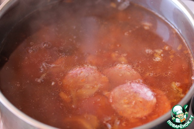 Замечательный суп для холодного времени года - густой, сытный, вкусный... Сухие грибы и копченая колбаса придают ему чудесный аромат и яркий вкус.