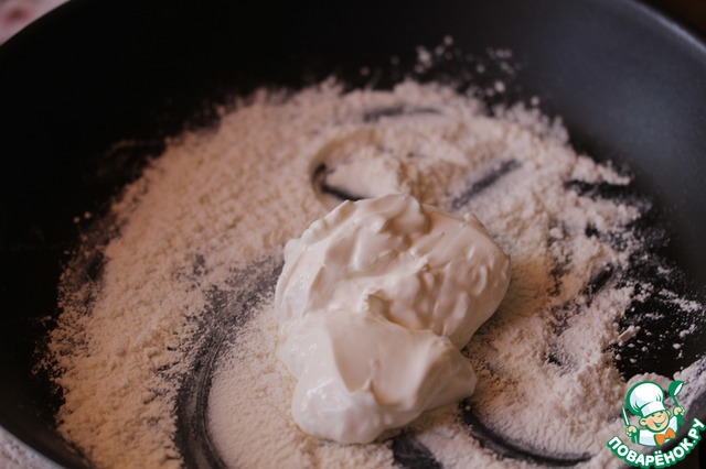 Добавить к ней сметану, быстро перемешать, влить немного воды, размешать, чтобы не было комочков.