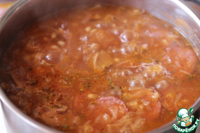К капусте с пеловкой и грибами добавить зажарку и нарезанную колбасу, долить кипяченной воды, посолить по вкусу, довести до кипения и варить на небольшом огне 5 минут.