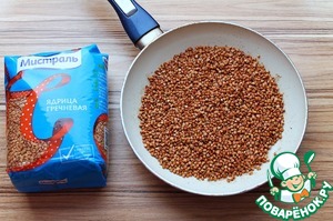 Гречку промыть, слить воду и обжарить на сухой сковороде до тех пор, пока гречка не станет полностью сухой.
