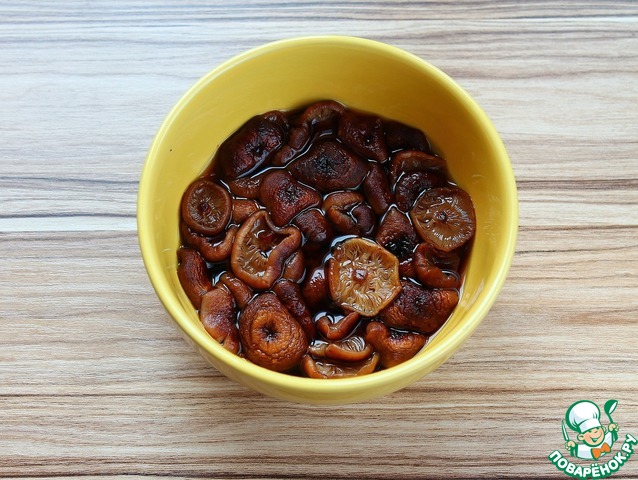 Грибы замочить в теплой воде минут на 10-15. Воду слить, грибы промыть.
