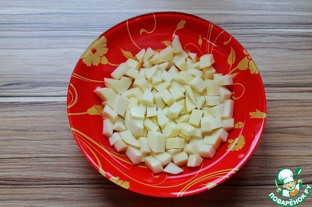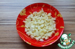 Картофель нарезать небольшим кубиком. После закипания воды, добавить картофель и варить до готовности всех ингредиентов, около 15 минут.