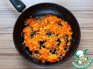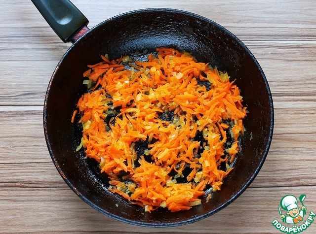 Лук нарезать мелким кубиком, морковь натереть на крупной терке. Овощи обжарить на разогретой сковороде с добавлением растительного масла, до мягкости. При необходимости, добавлять в сковороду небольшое количество воды, чтобы овощи не пригорали.