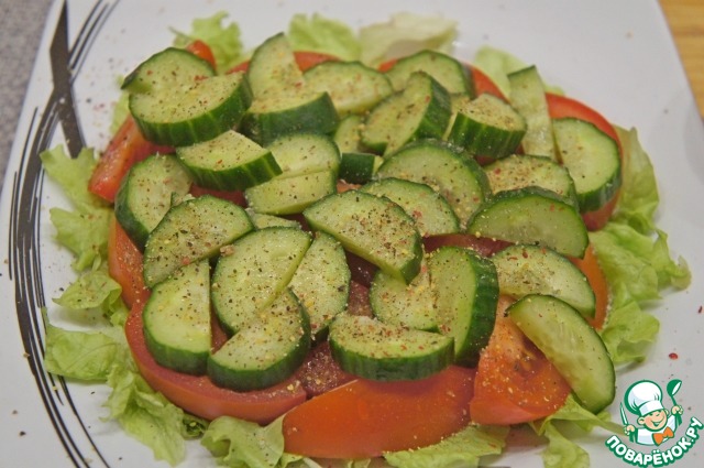 • Листья зеленого салата нарвать на небольшие кусочки и засыпать ими плоское блюдо. Можно использовать верхнюю часть листьев пекинской капусты. Помидоры нарезать крупными дольками и выложить на салат.