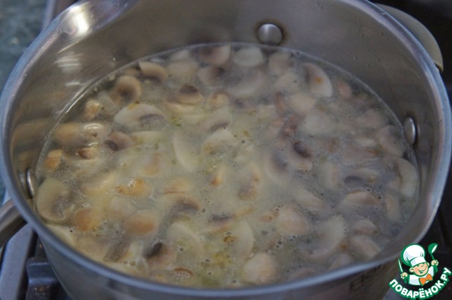 Тушеные грибы с луком выложить в кастрюлю, залить 1 л воды и довести до кипения.