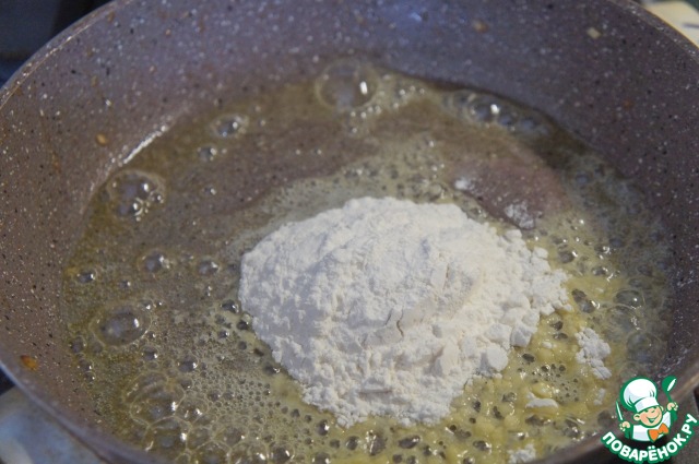 Добавить муку и обжарить до появления кремового цвета.