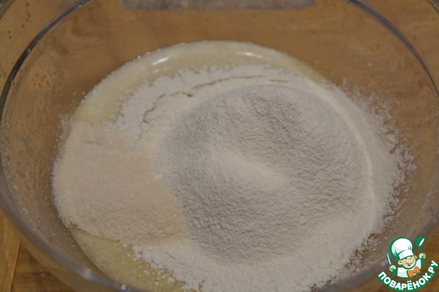 Просеять муку с разрыхлителем, ванильный сахар и замесить тесто.