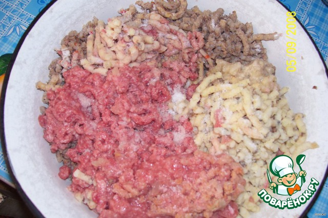 Пропустить через мясорубку: гречку, фарш, хлеб,
