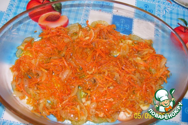 В форму, выложить морковку с луком.