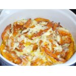 Залить всё соусом: смешать майонез, сметану, яйцо (солить по вкусу). Запечь в духовке до готовности, примерно 20-25 минут. За 10 минут до окончания посыпать сыром.