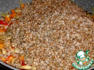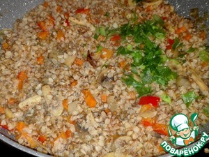 Ингредиенты: вареная гречка, шампиньоны, лук-шалот, морковь, болгарский перец.