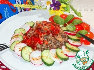 Сервировала блюдо с гречкой нарезанными свежими овощами, которые посыпала красным перцем и солью.
