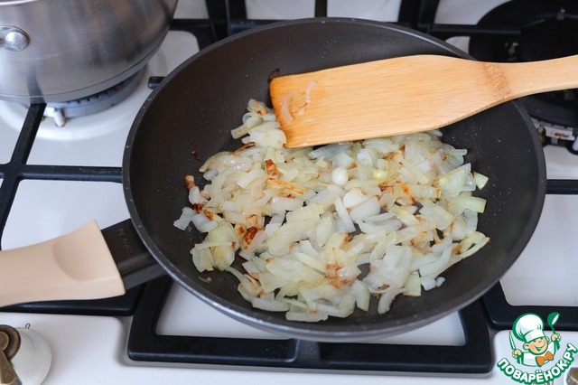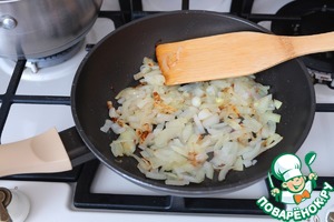 Пассеровать лук до золотистой корочки.