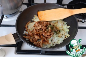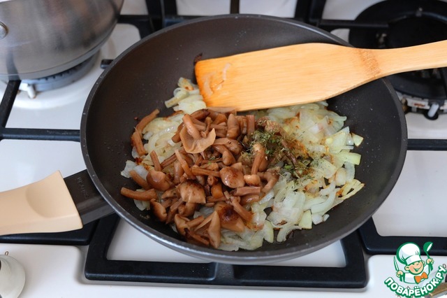 Добавить к луку опята, добавить орегано (1/2 ч. ложки).
