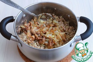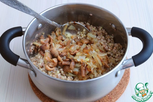 Добавить луково-грибной фарш в гречку. Перемешать.